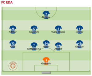 Doch EDA zeigte Moral: Eine missglückte Rückgabe eines Racing-Verteidigers, ausgelöst durch gutes Pressing, wurde zum Bumerang – der Ball trudelte zum 2:1 ins Netz (25’). Damit war EDA zurück im Spiel und konnte das Geschehen vorübergehend ausgeglichen gestalten.